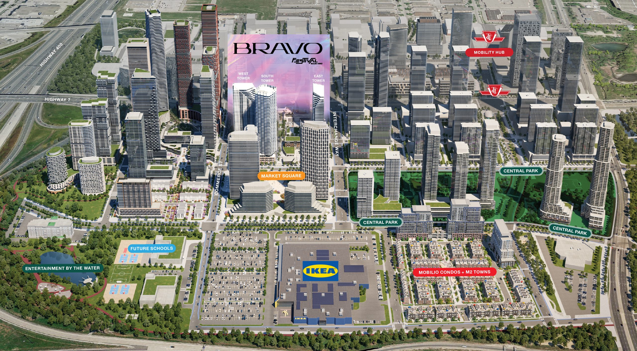Bravo Condos is a New Condo development by Menkes Developments Ltd. located at Commerce St & Interchange Way, Vaughan. Comprised of 4 condo towers and townhome units, Bravo Condos is the next residential phase at Festival VMC, the country's best-selling condo community and one of Canada's largest master-planned communities. Located in the new heart of downtown Vaughan and just minutes from Vaughan Metropolitan Centre, VMC.